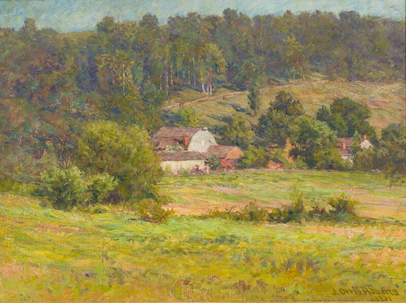 An oil on canvas having green grass and small trees in foreground. Several houses and barns in mid-ground. Hill covered with green trees in background with narrow ribbon of blue sky along top of picture.